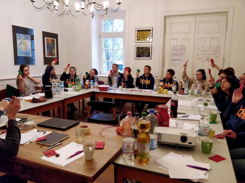 Also brachen wir am Montagmorgen auf und obwohl wichtige Fortbildungen von Externen uns zunächst im Wege standen, konnten sie unser motiviertes Team nicht daran hindern, sofort nach der Ankunft mit der Arbeit loszulegen. Dabei stellten zuerst alle Teammitglieder der einzelnen Themenkreise ihre Ausarbeitungen vor. Damit wurden alle inhaltlich auf dem aktuellsten Stand gebracht und es wurden Feedback und neue Ideen gesammelt. Es hat sich seit der ersten SOM-Fahrt viel getan. Die Hauptaufgabe war folglich die Findung des Titels für das kommende Symposium, was nicht so schnell und einfach war. Viel Kreativität war gefragt, denn der fertige Titel musste nicht nur „catchy“ sein, sondern sich auch in allen Themenkreisen widerspiegeln. Bis spät abends saßen wir sowohl in Kleingruppen und als auch in offenen Diskussionsrunden zusammen und erste Titelansätze wurden bereits gebildet. Auf dieser Basis starteten wir am nächsten Morgen wieder von vorne los und es folgten wieder Brainstorming-Sessions und Gruppenarbeiten. Es wurden viele Titelideen in der Runde bearbeitet, verworfen und wieder hinzugefügt. Nach dem langen Tag kamen wir schließlich bei der finalen Abstimmung auf ein knappes Ergebnis. Dennoch waren alle glücklich und einig mit dem fertigen Titel und das Team konnte durch die letzten zwei Tage noch enger zusammenwachsen.